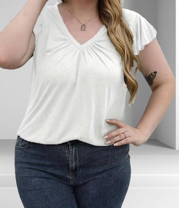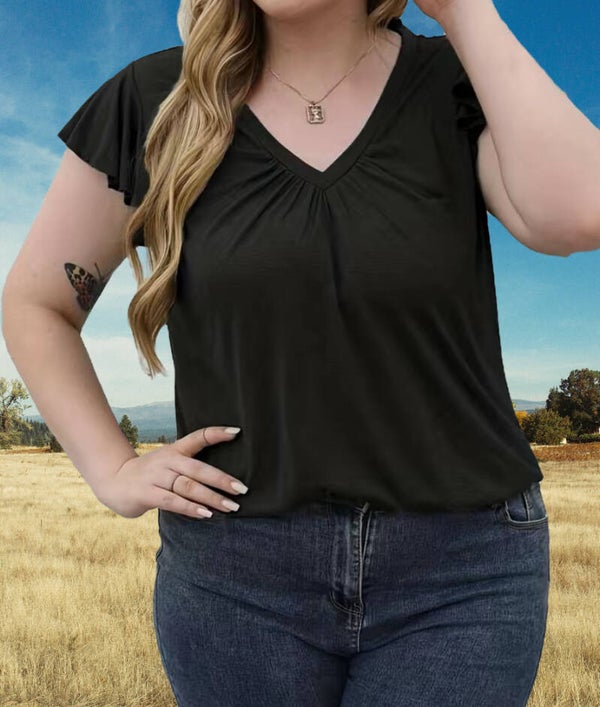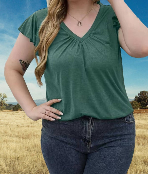 Women's Plus Solid V Neck Ruffle Cap Sleeve Ruched Medium Stretch Tee.
