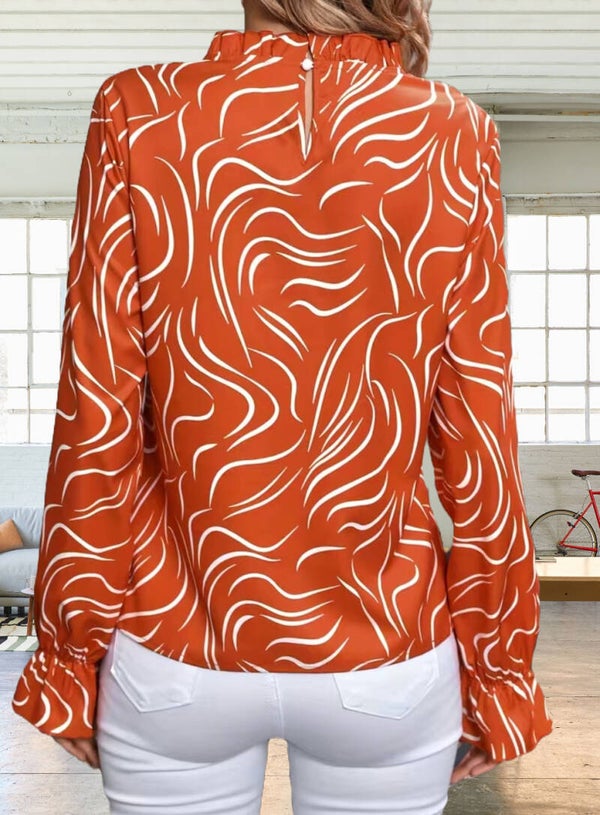 Women's Print Lettuce Trim Blouse, Casual Long Sleeve Blouse For Spring & Fall.