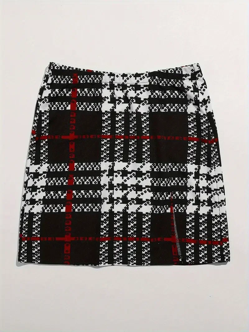 Women's Solid Crop Cami Top and Plaid Print Elastic Waist Skirt 2pc Set.