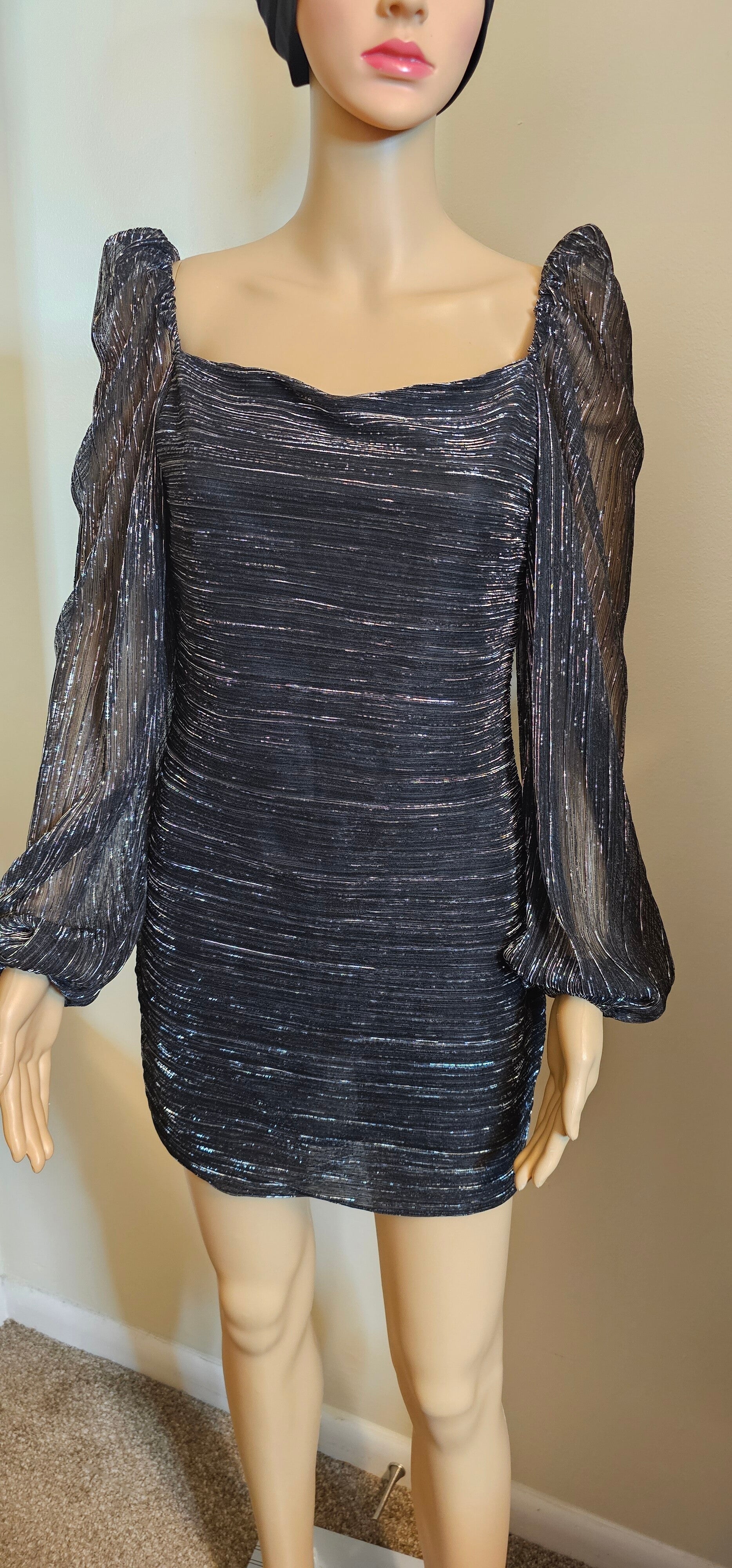 Women's Glamorous Metallic Shimmer Bodycon Mini Dress. This shimmering mini dress features a structured bodice with a square neckline and puff sleeves. Its glittery finish and tailored silhouette make it perfect for evening wear. Available in multiple sizes with a zip-up back for a sleek fit.