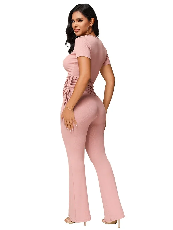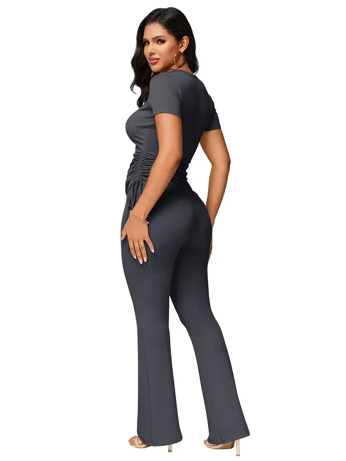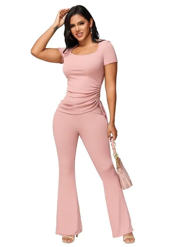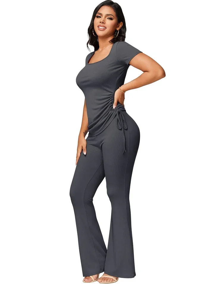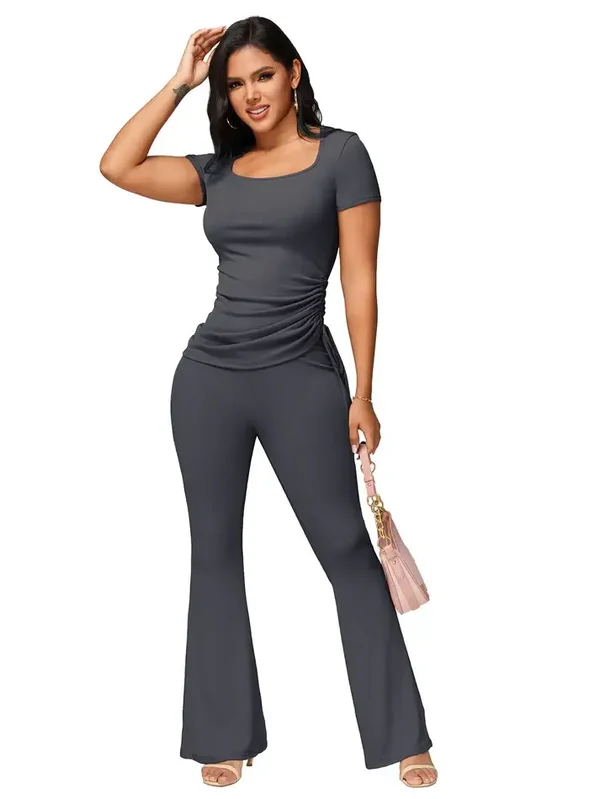 Sculpt your silhouette in this ribbed two-piece ensemble, featuring a figure-hugging, square-neck top with adjustable cinched sides and elegant, high-waisted flare trousers that move with you.