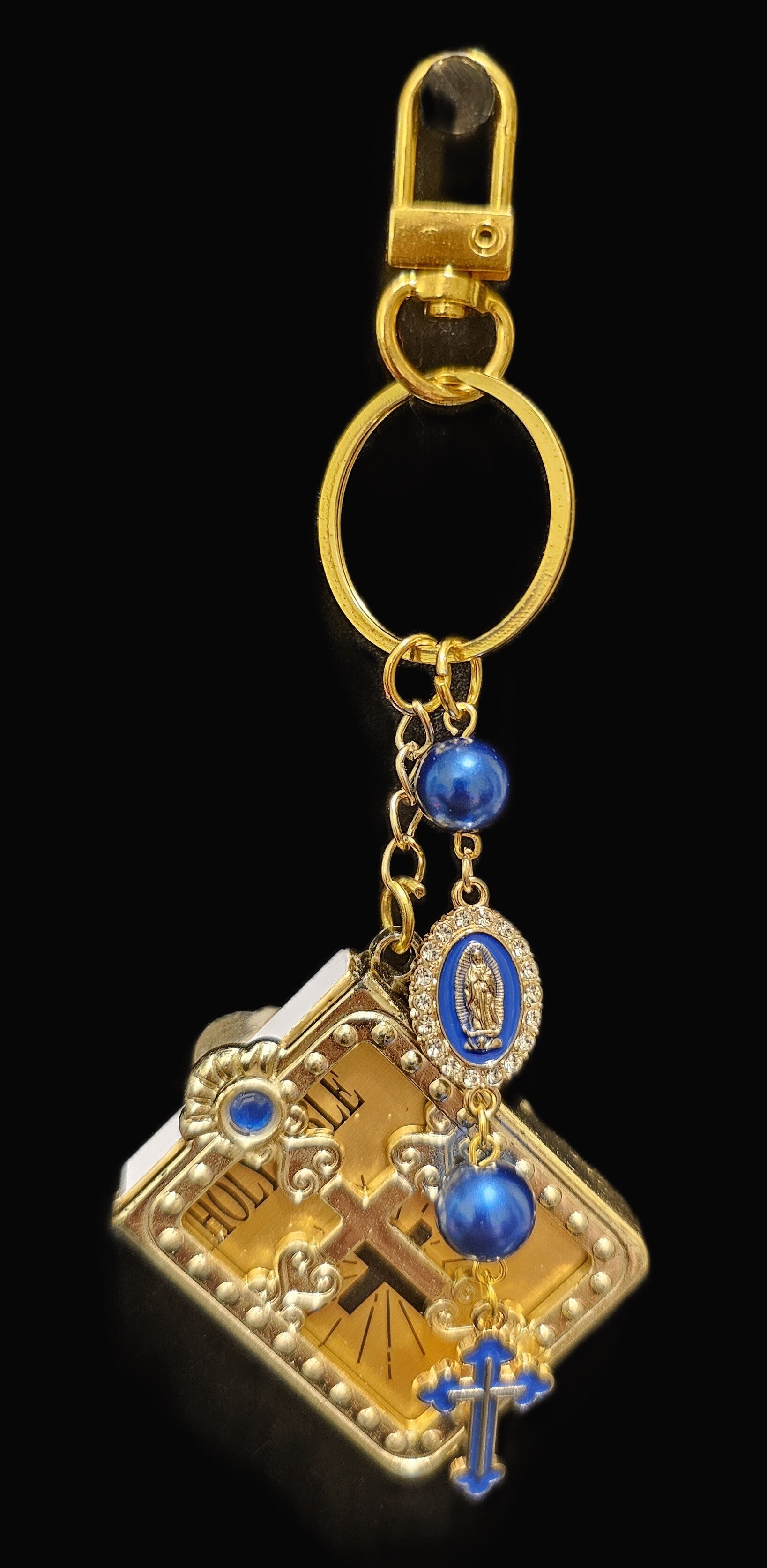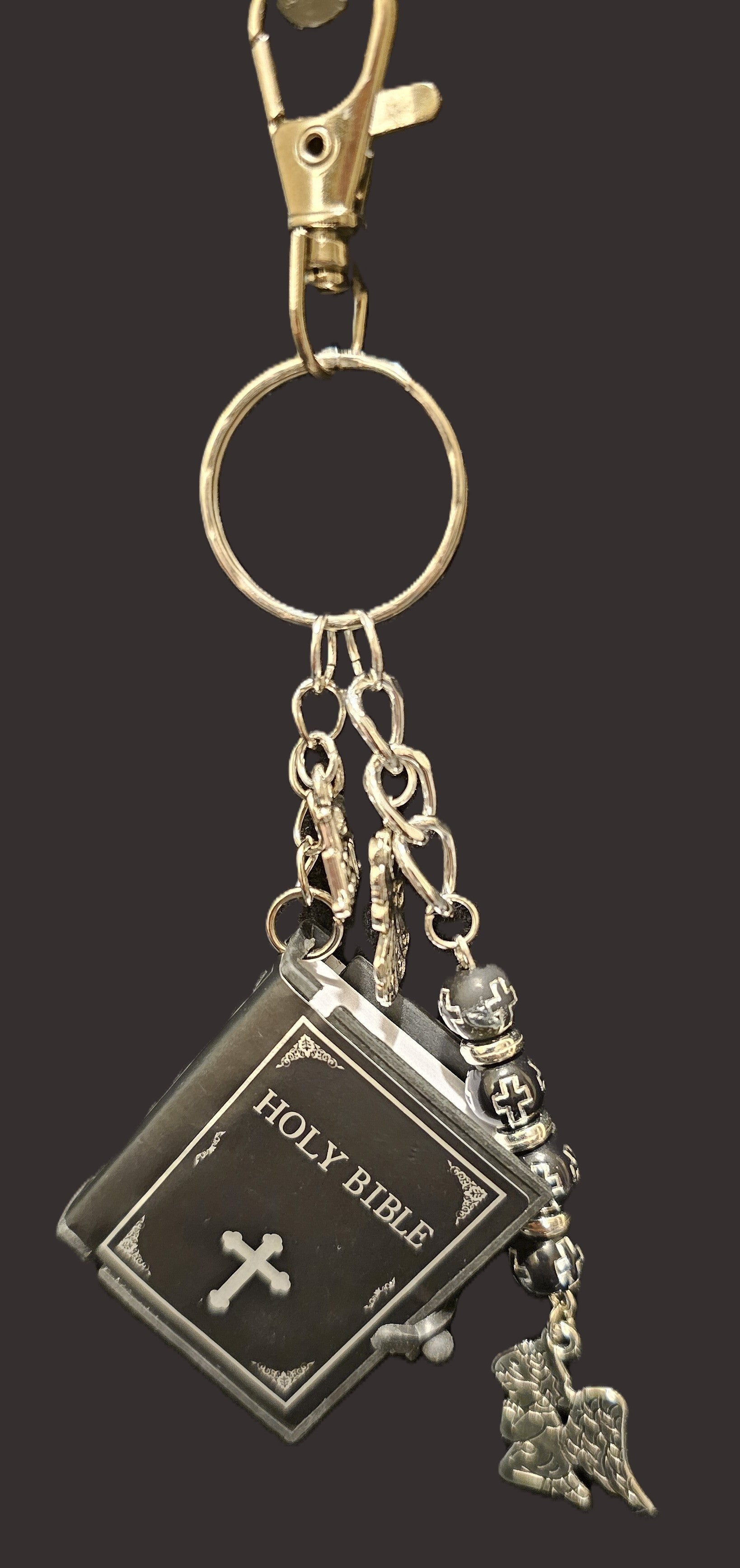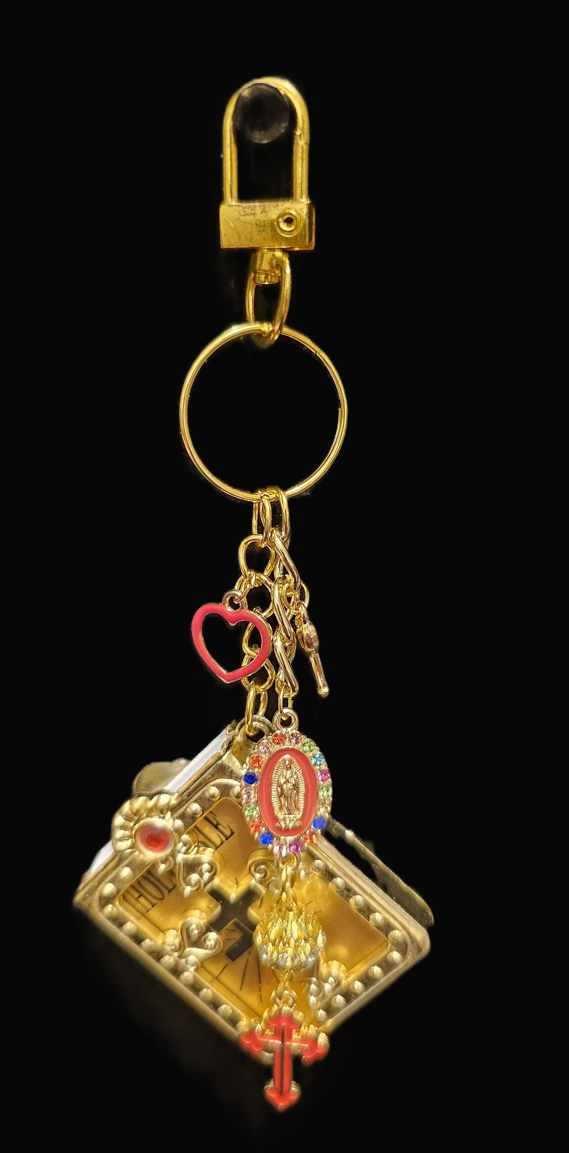 Handmade keychain featuring a mini Bible, and others details. A meaningful accessory perfect for keys, bags, or as a small faith‑inspired gift.