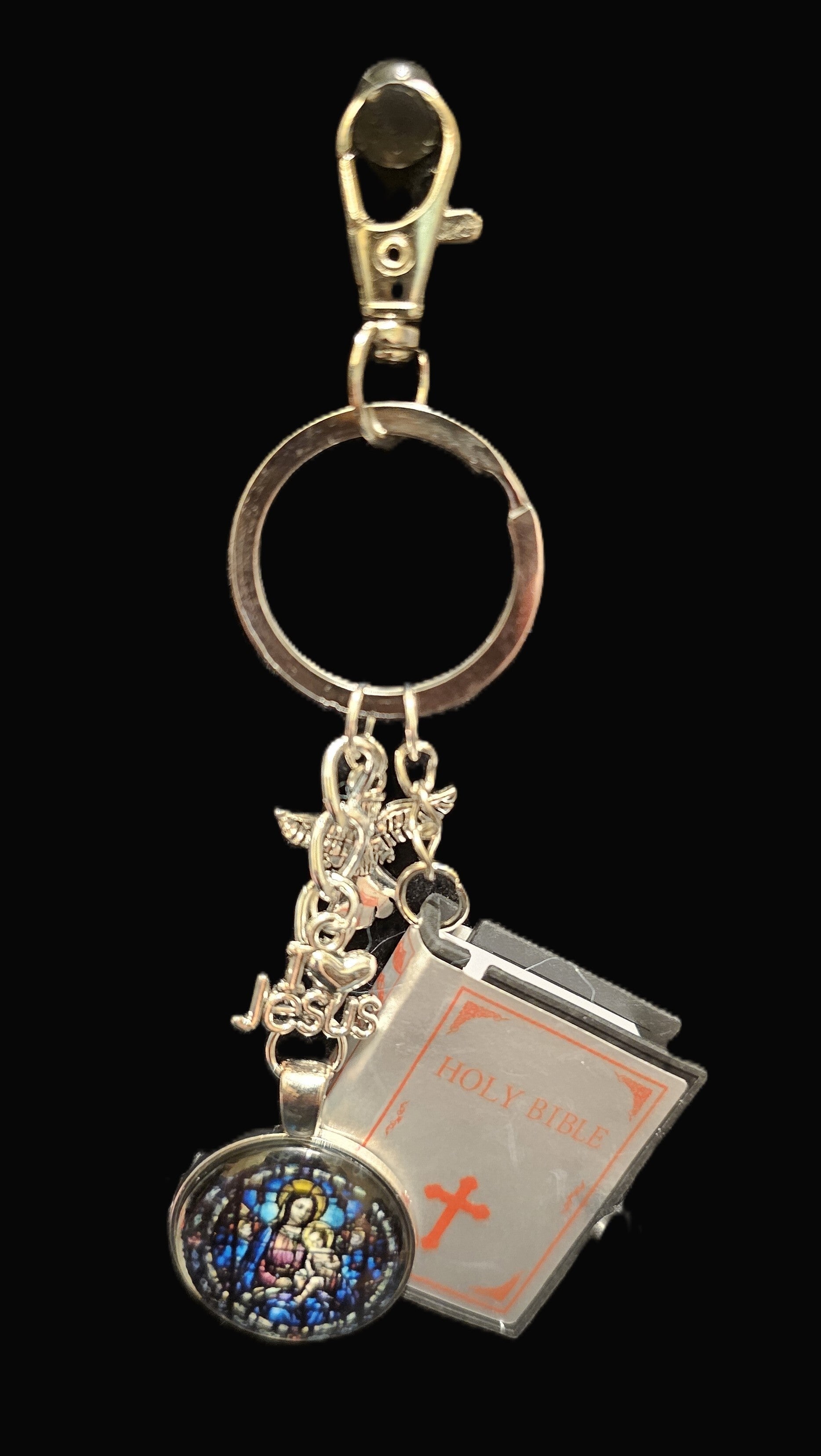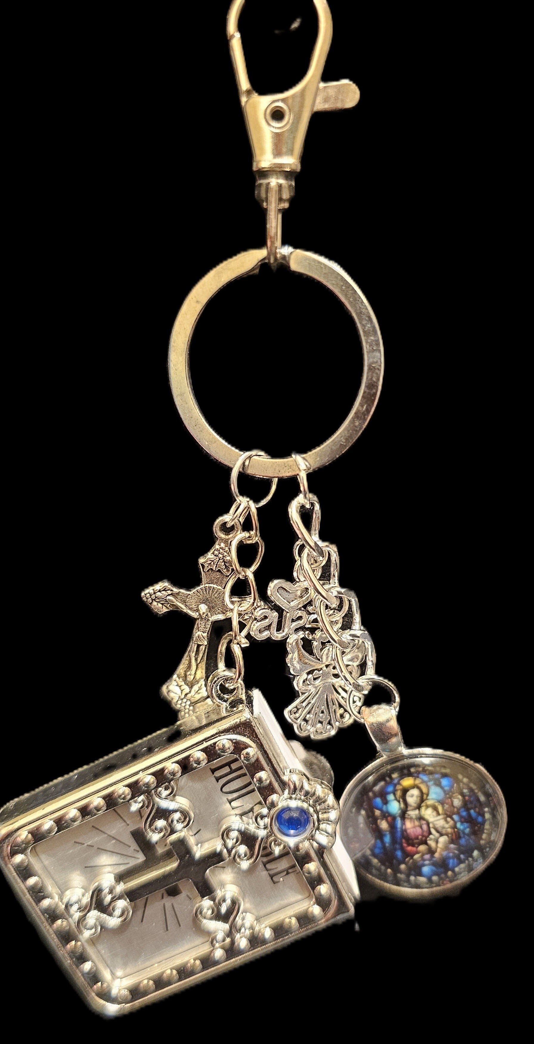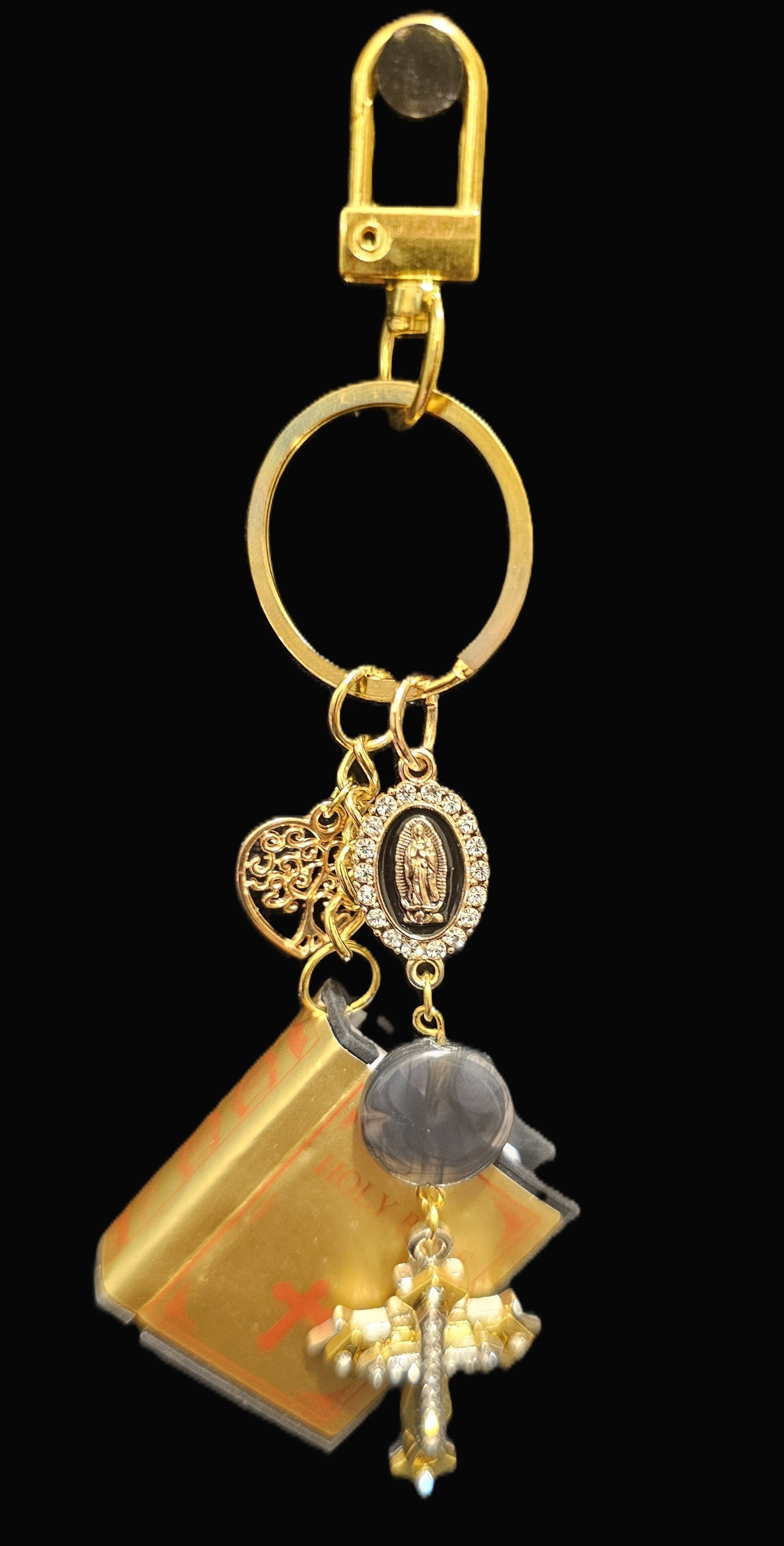 Handmade keychain featuring a mini Bible, and others details. A meaningful accessory perfect for keys, bags, or as a small faith‑inspired gift.
