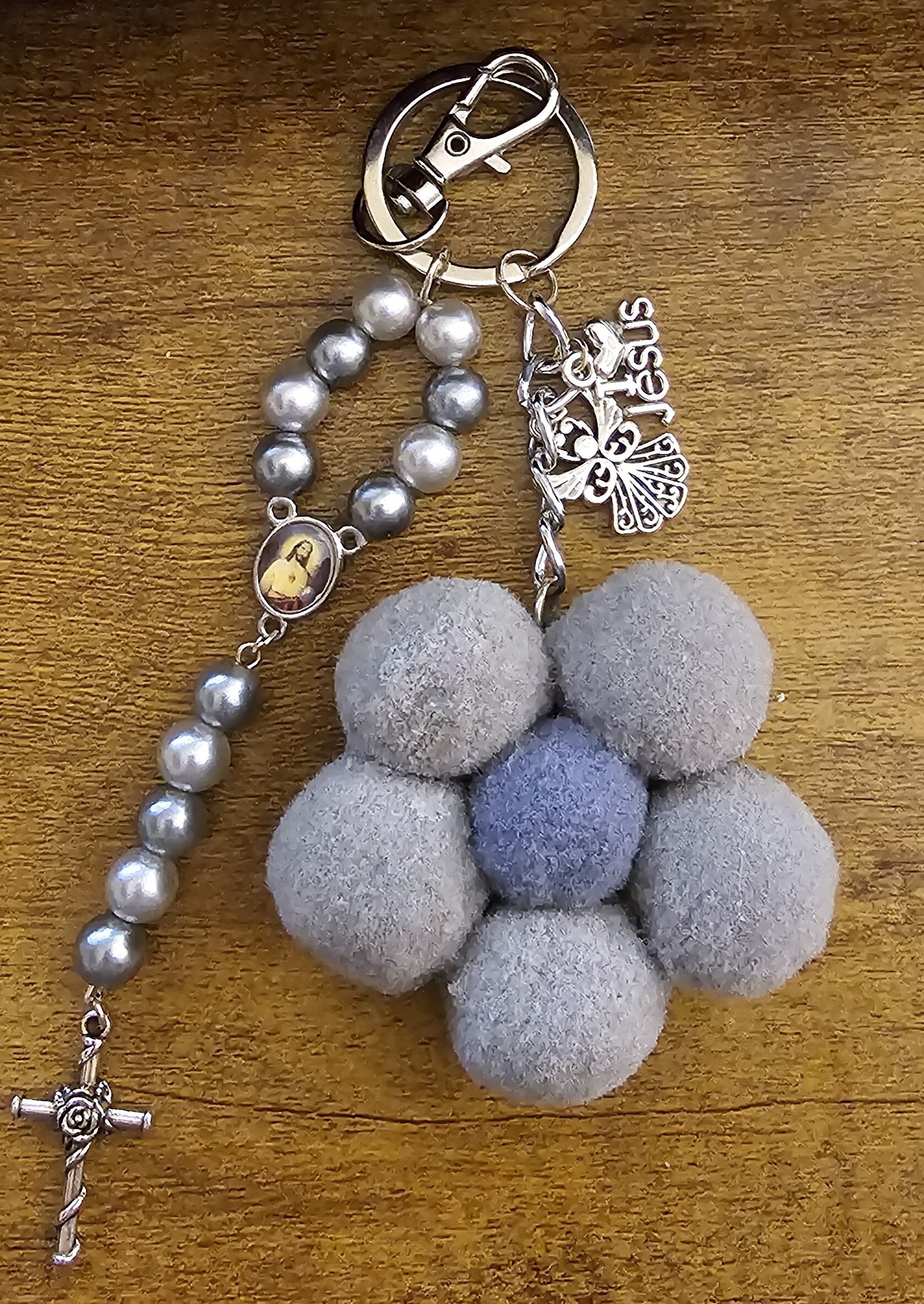 This unique, 100% handmade keychain features a soft, plush pom-pom flower crafted by hand, paired with a delicate bead strand, a meaningful religious charm, and cross. It’s the perfect accessory for your keys, purse, or backpack.