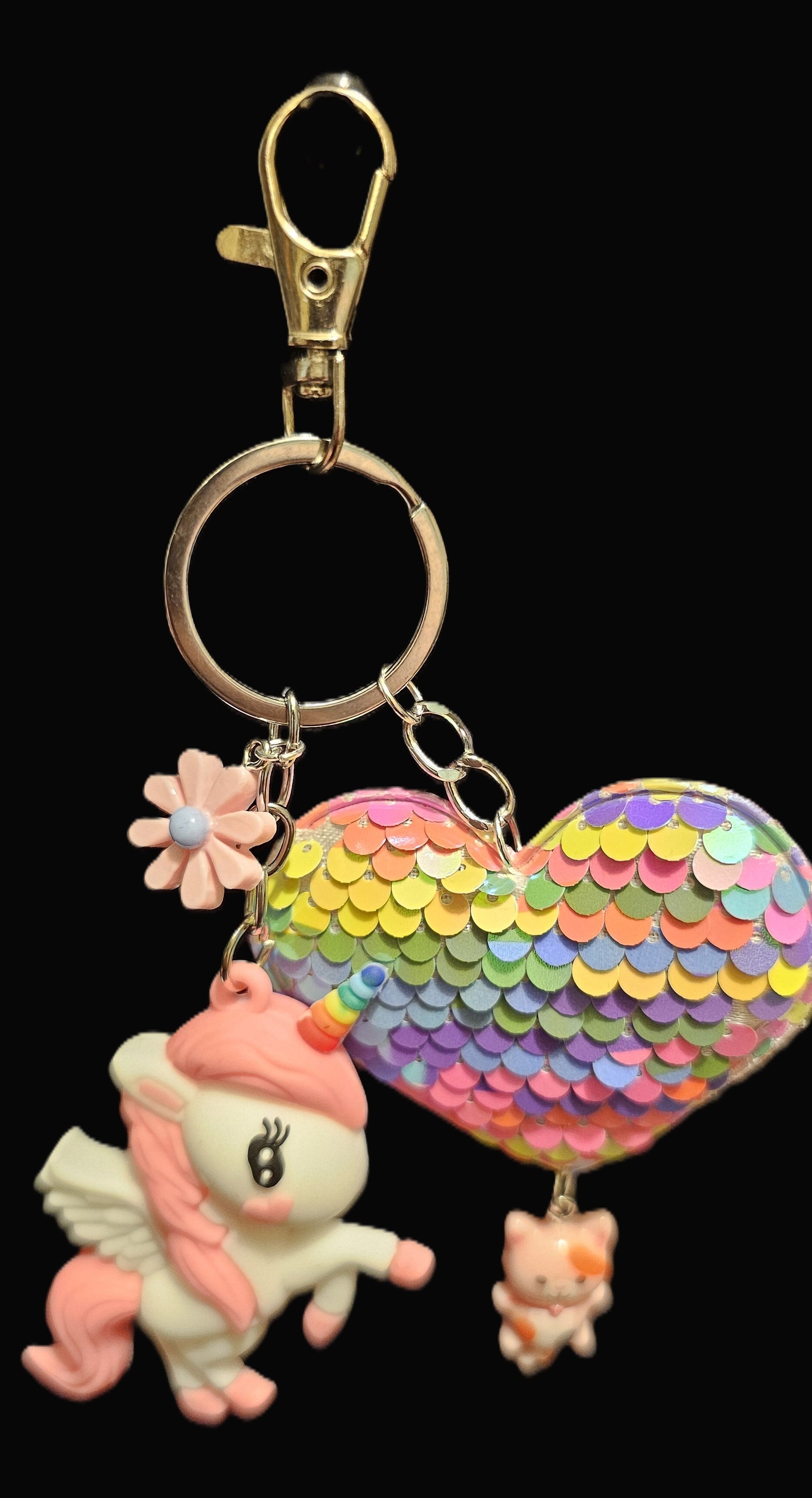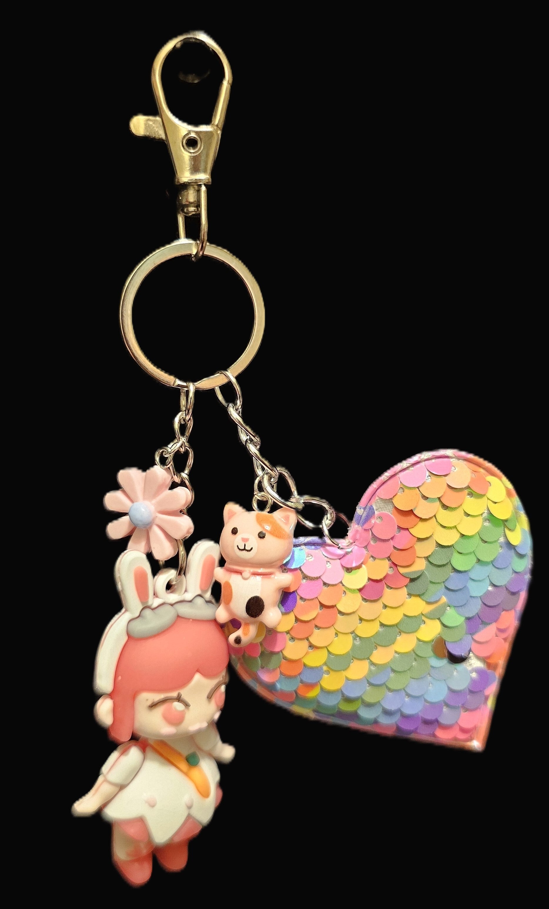 Featuring a vibrant, multi-color sequin heart and a charming character, this keychain is designed to bring a smile to your face. It's the perfect mix of shine and sweetness for your bag, keys, or backpack.