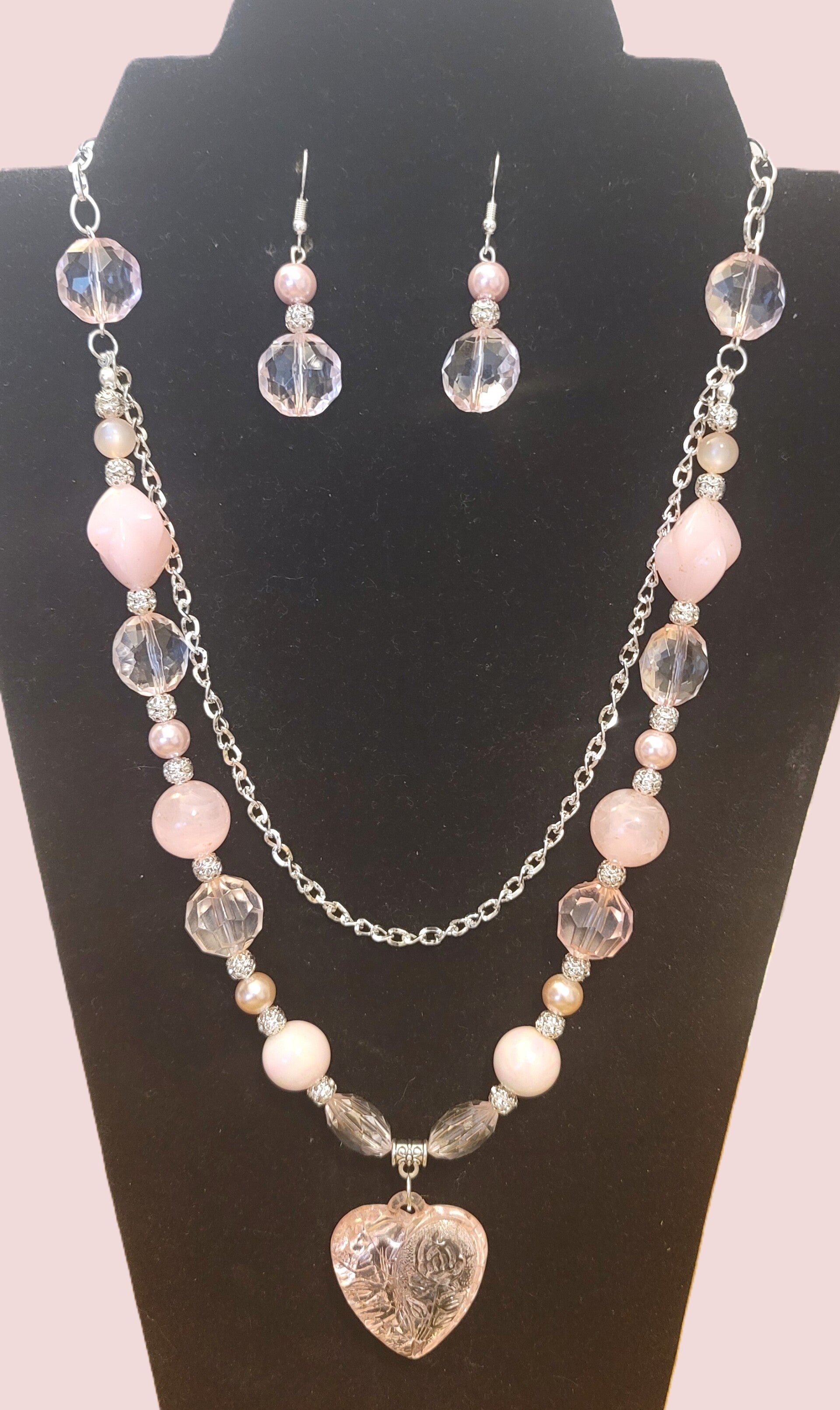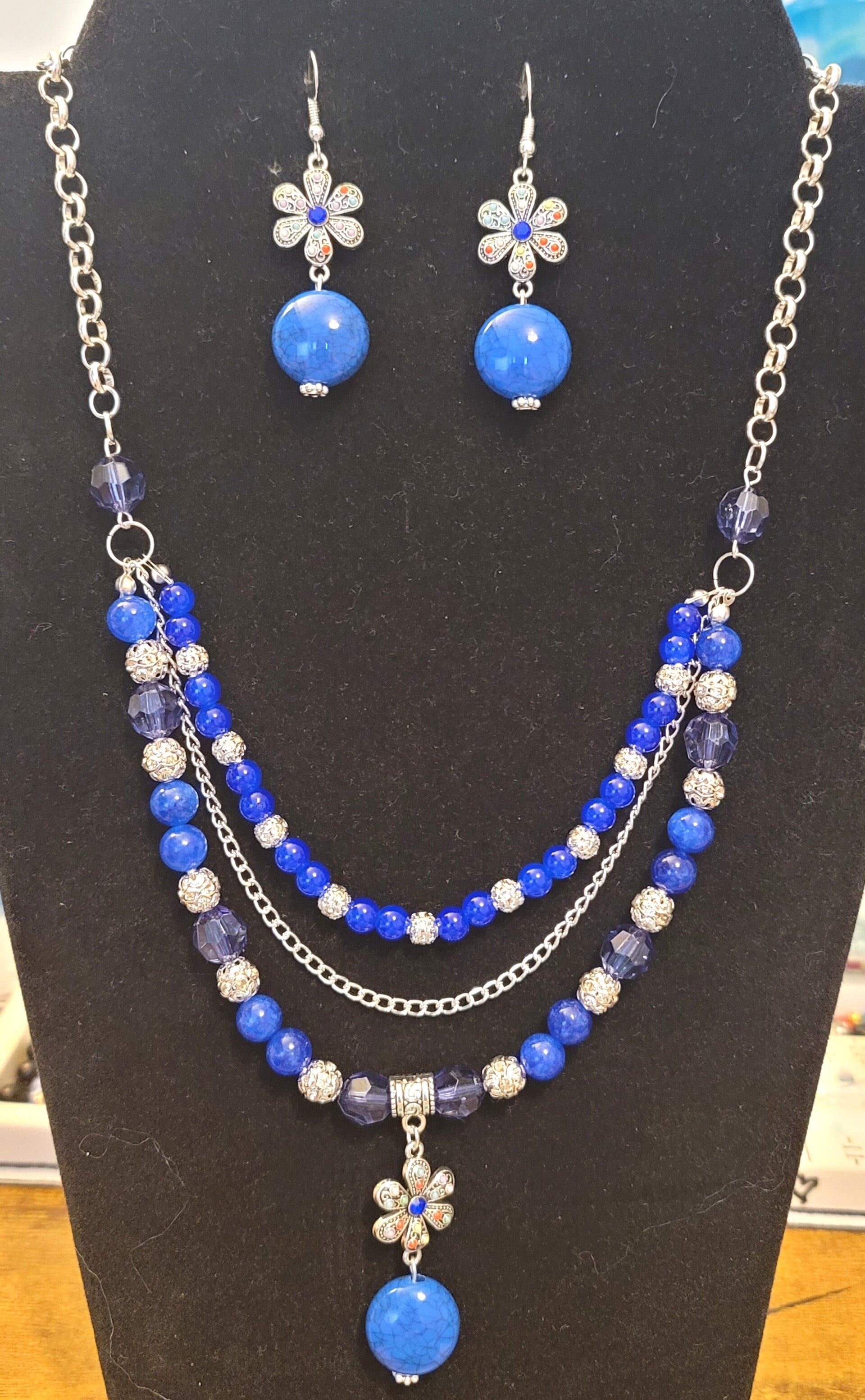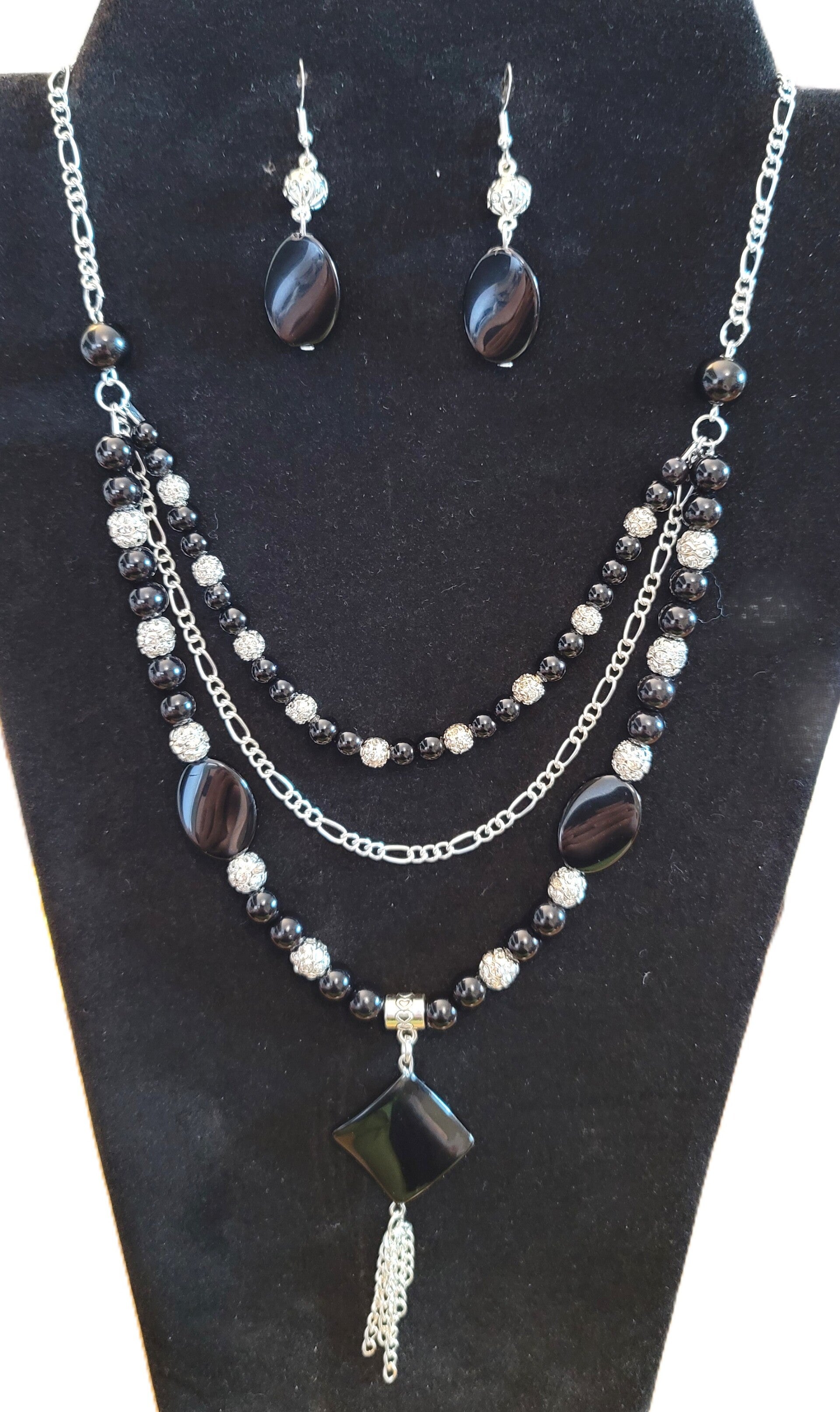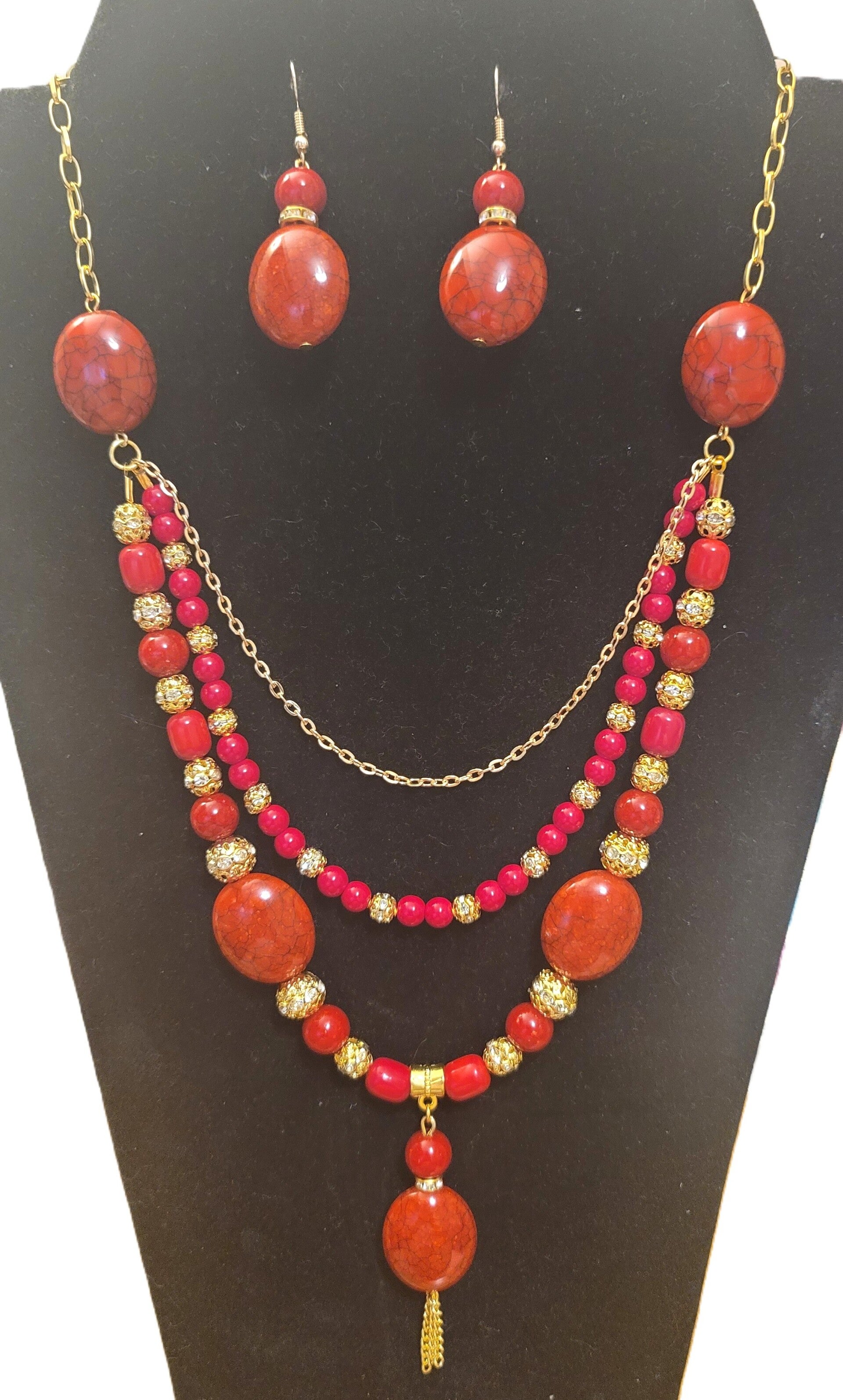This stunning set features a beautifully designed multi-layered necklace paired with matching earrings, creating a sophisticated look that complements any outfit.
