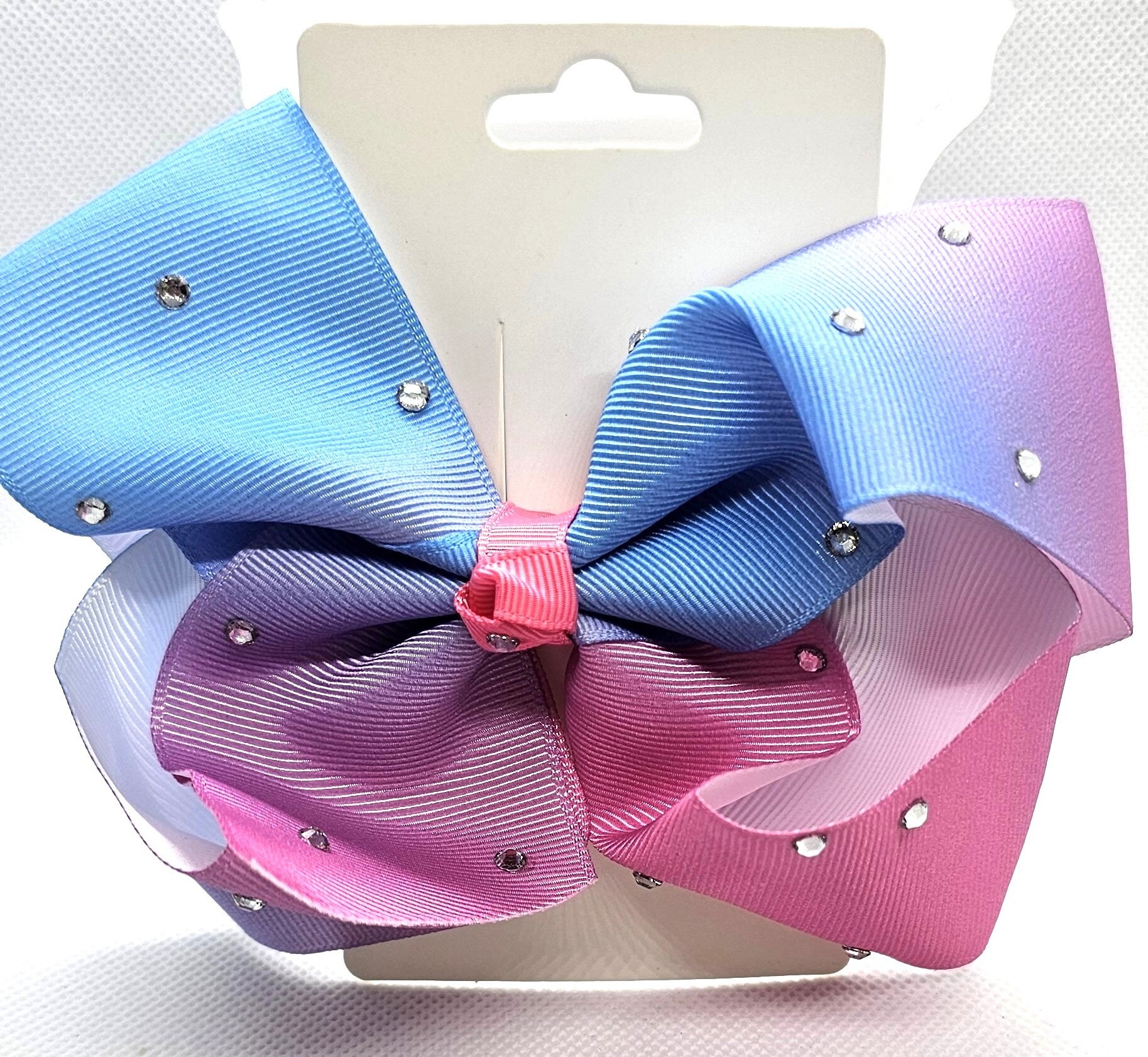 Add a magical touch to any hairstyle with this vibrant ombre hair bow. Featuring a beautiful gradient of colors and scattered sparkling rhinestones, this oversized bow is the perfect statement piece for girls who love to shine.