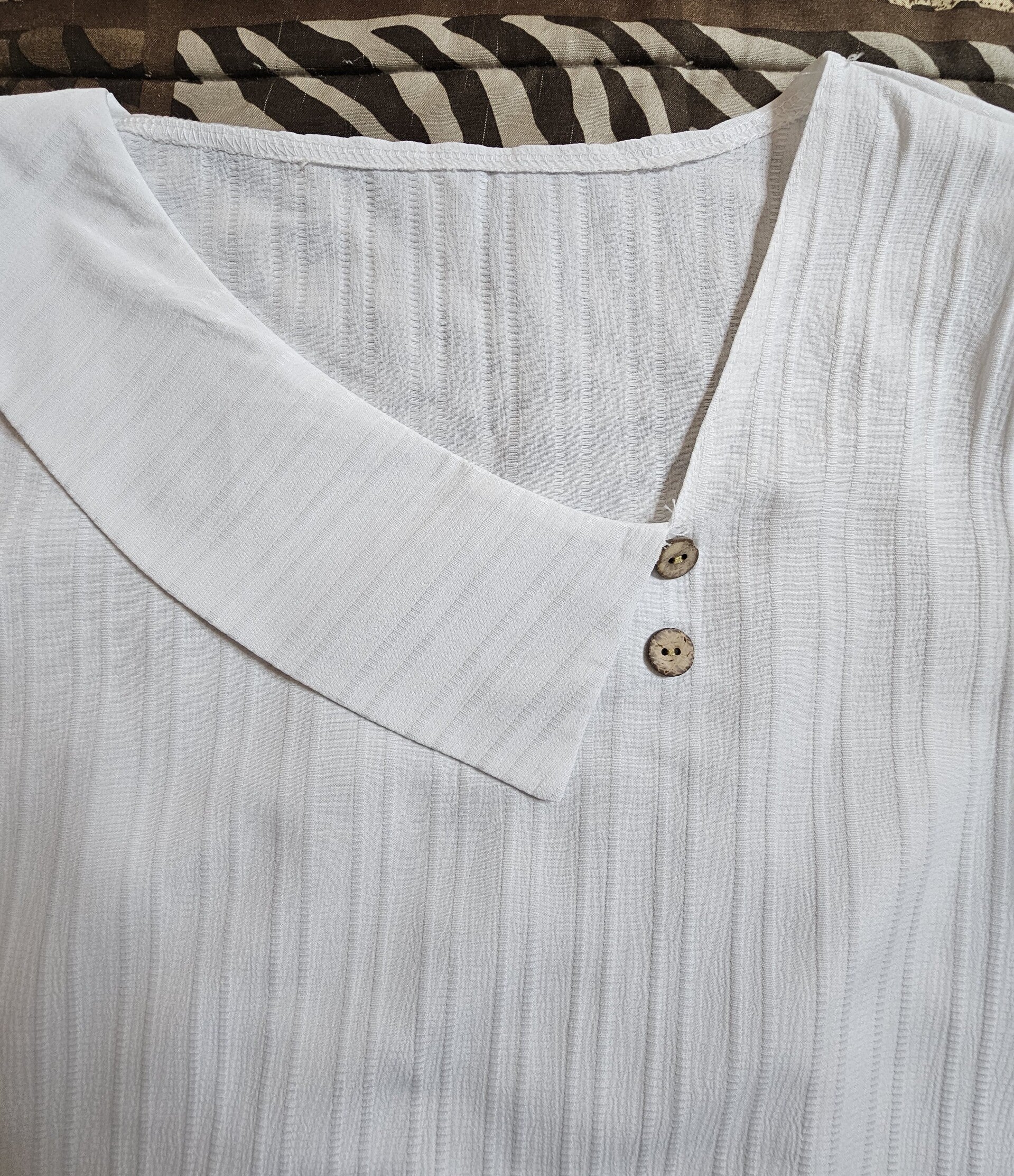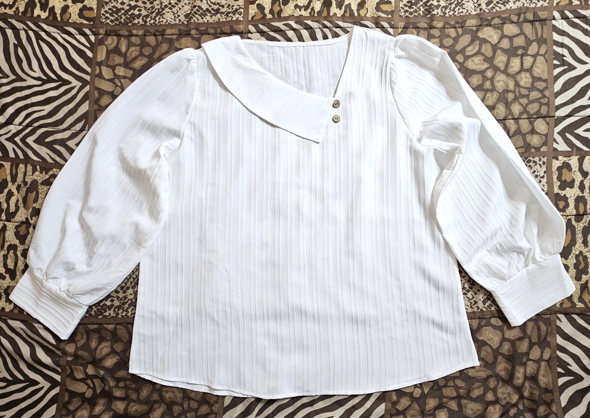 Add a touch of modern elegance to your wardrobe with this sophisticated striped blouse. Featuring a unique asymmetrical fold-over collar accented with decorative buttons and subtle vertical texture, this tailored top offers a polished look for the office or a casual chic outing.