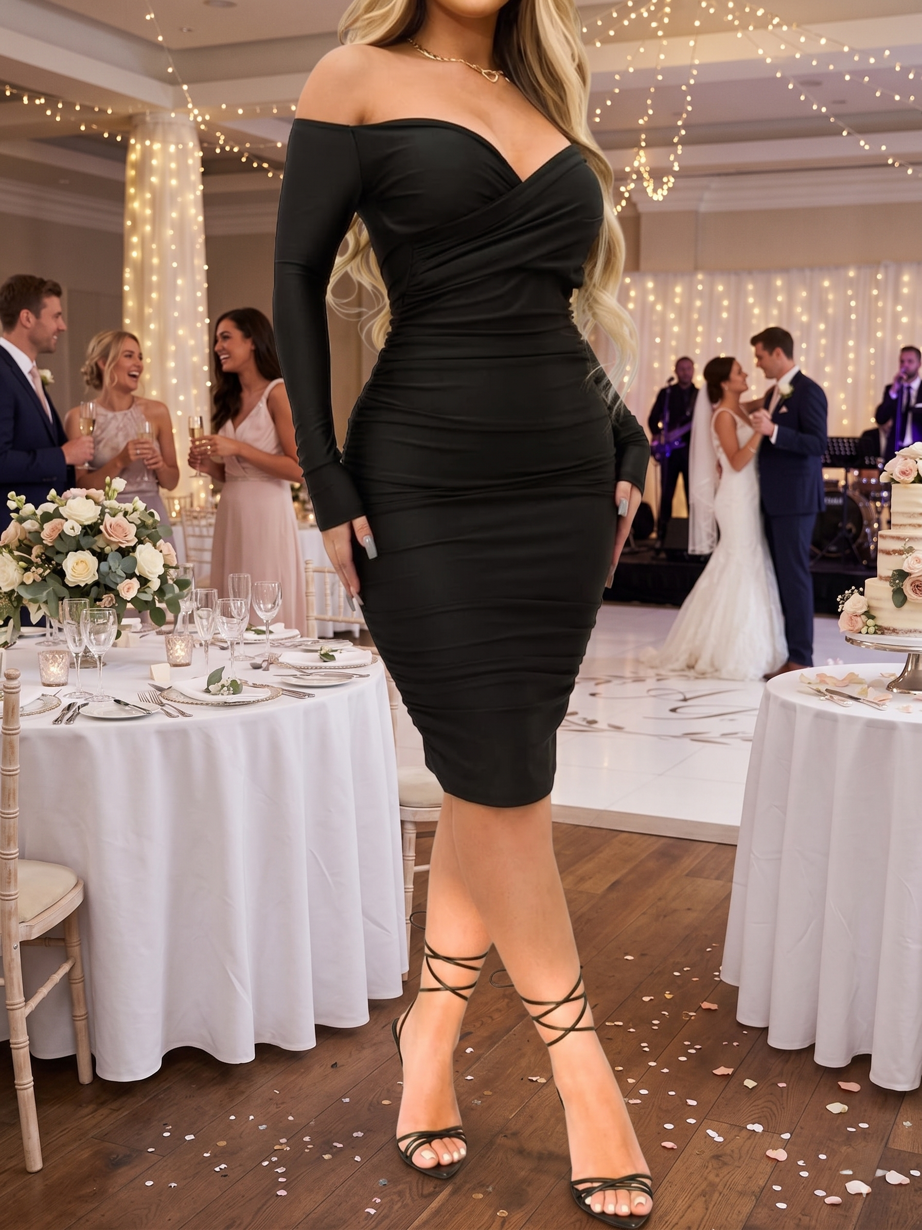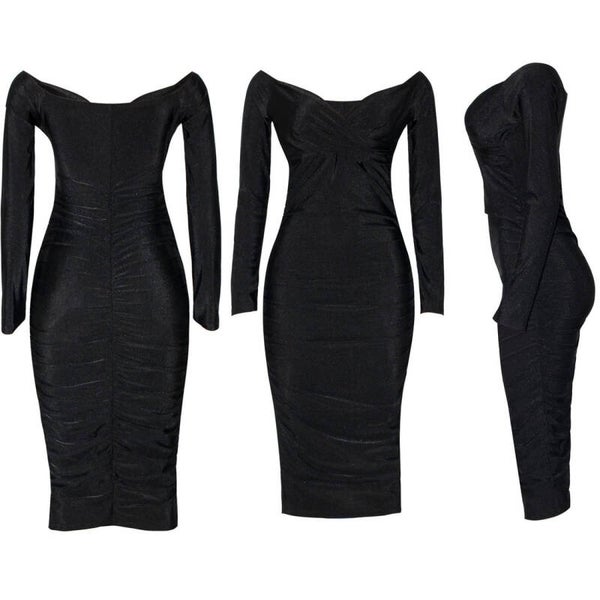 Stun at your next event with this elegant off-the-shoulder midi dress featuring a flattering ruched design that hugs your curves in all the right places. Its sophisticated sweetheart neckline and sleek silhouette make it an essential piece for weddings, parties, or any special occasion.